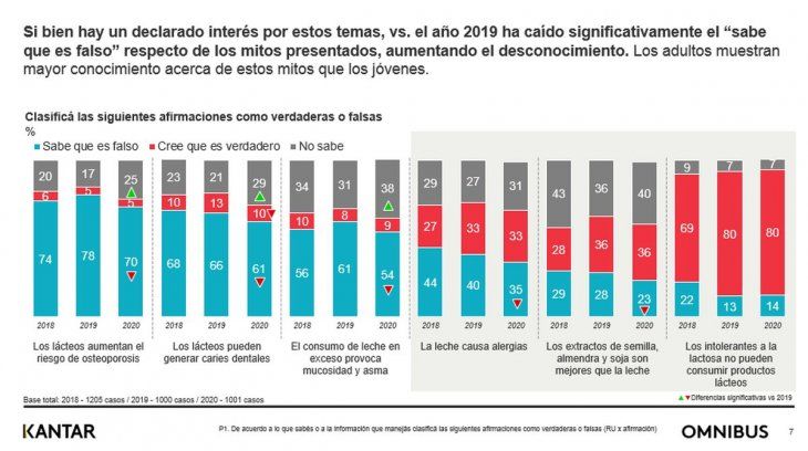 “Por ejemplo, son muy pocos los que no sabían que eran falsos los mitos ‘los lácteos aumentaban el riesgo de osteoporosis y de caries’, pero las respuestas estaban más divididas con los mitos sobre si ‘los extractos de maní y soja eran mejores que la leche’ o sobre si los intolerantes a la lactosa no podían consumir productos lácteos. Y cabe agregar que hasta quienes presentan este problema tienen la opción de opciones deslactozadas”, remarcó Souto.